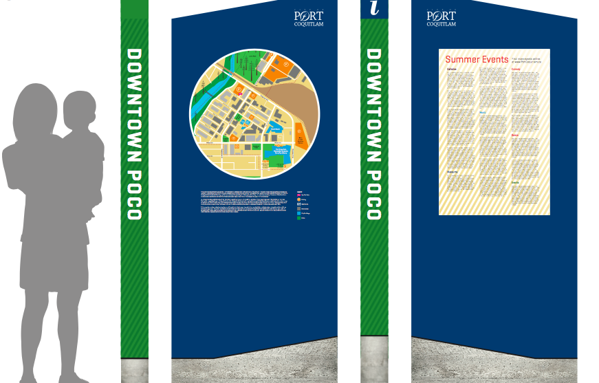 Downtown Port Coquitlam is close to major travel arterials, surrounded by popular parks and home to a major transit hub. But it is still hard to locate and difficult to navigate. We created a branded wayfinding strategy to connect all the neighbouring elements to each other, enhance public space, and blend the historic elements of the downtown with a more contemporary feel.